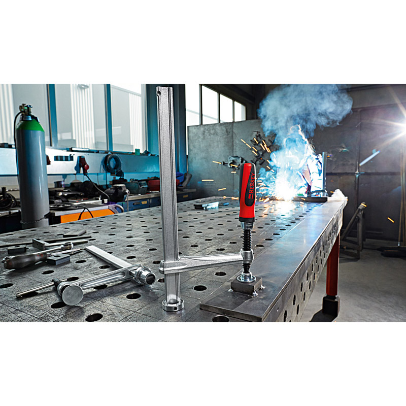 • Profil en acier traité et étrier coulissant pour un serrage souple et élastiqueDifférents modèles : / Poignée plastique haut de gamme à 2 éléments et poignée à ailes courtes à bouts arrondis – resp. avec broche filetée trapézoïdale très maniable et plaque de pression amovible sans outils
